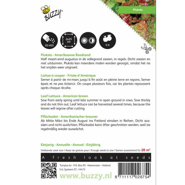Pluksla Amerikaanse Roodrand is een plukslaras met rood-groen, lichtgekroesd blad. Pluksla vormt geen gesloten krop, maar een open bladrozet waarvan het blad in gedeelten naar behoefte kan worden geplukt.