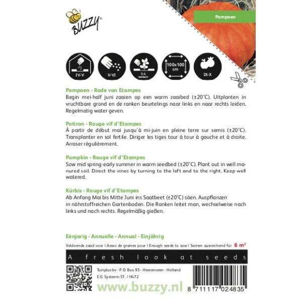 Uitplanten op 200 x 100 cm. Ze hebben veel voedsel nodig en de lange, zwaar bebladerde, holle ranken klimmen overal in en op. Pompoenen worden ook wel op composthopen geteeld.