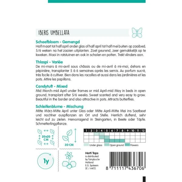 Een mooi randplantje dat geschikt is voor de voorrand van de border. Zaait zich uit in de onmiddelijke omgeving van de plant. Plukken verlengt de bloei. De plant is zoet geurend en zeer gemakkelijk op te kweken.