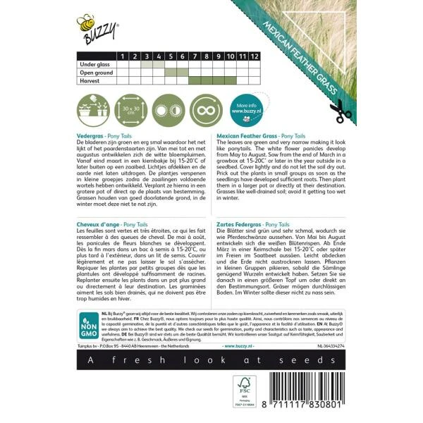 Vedergras Pony Tails of Stipa tenuissima is een zeer fijn siergras met erg smalle bladeren waardoor het net lijkt of het paardenstaarten zijn. De witte bloempluimen die zich van mei tot augustus ontwikkelen hebben een grote sierwaarde en zijn leuk te combineren met vaste planten in de border. Komt goed tot zijn recht in groepjes maar kan ook in potten worden aangeplant. Vedergras blijft mooi tot in de herfst en is winterhard.