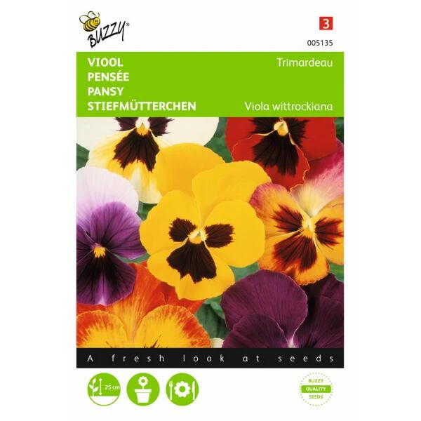 Dit mengsel middelgroot bloemige violen van de ‘Trimardeau’ groep, kunnen zowel een- als tweejarig worden geteeld. De bloemen hebben een duidelijke donkere vlek rond het hart en kunnen verder de meest uiteenlopende pasteltinten vertonen. De planten worden ca. 25 cm. hoog. Ze voldoen hierdoor uitstekend in randen, perken, borders en bloempotten en bloembakken.